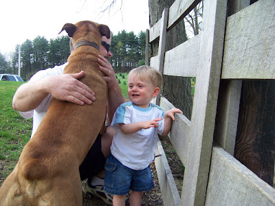 We took Jackson out to Allen and Teresa Gress's yesterday to let him see the baby calf's and the goats. We didn't get to see many calf's, but he loved the goats. He loves animals. We also had our first boo-boo. He fell on the cement and scraped his knee...never made one sound. Then we were at the Gress's and he rolled down the hill. He cried then. Needless to say, he was filthy last night and I'm sure that with summer coming, every night will be filthy and funtime in the tub.